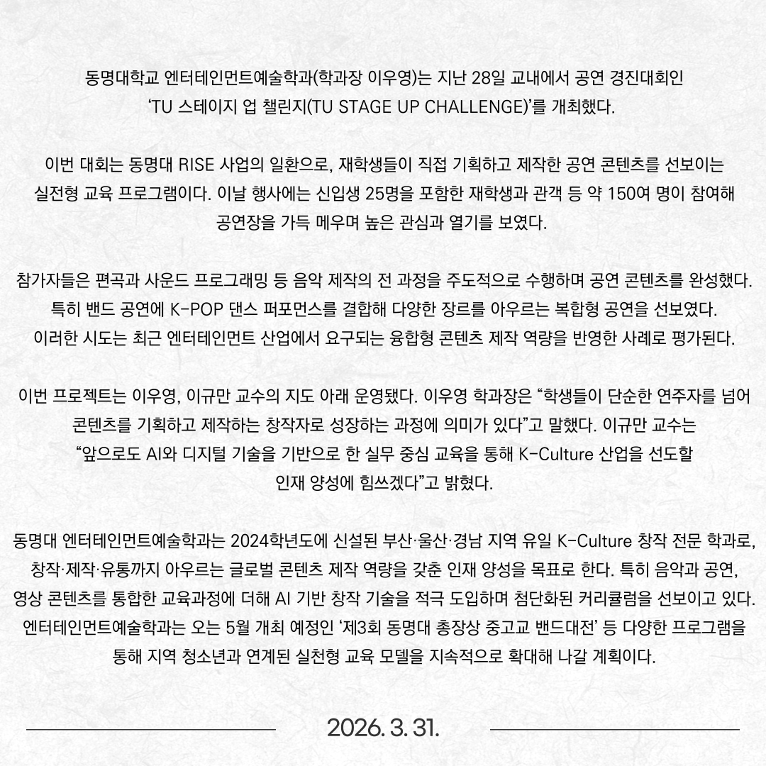 엔터테인먼트예술학과, 공연 경진대회 ‘TU 스테이지 업 챌린지’ 개최