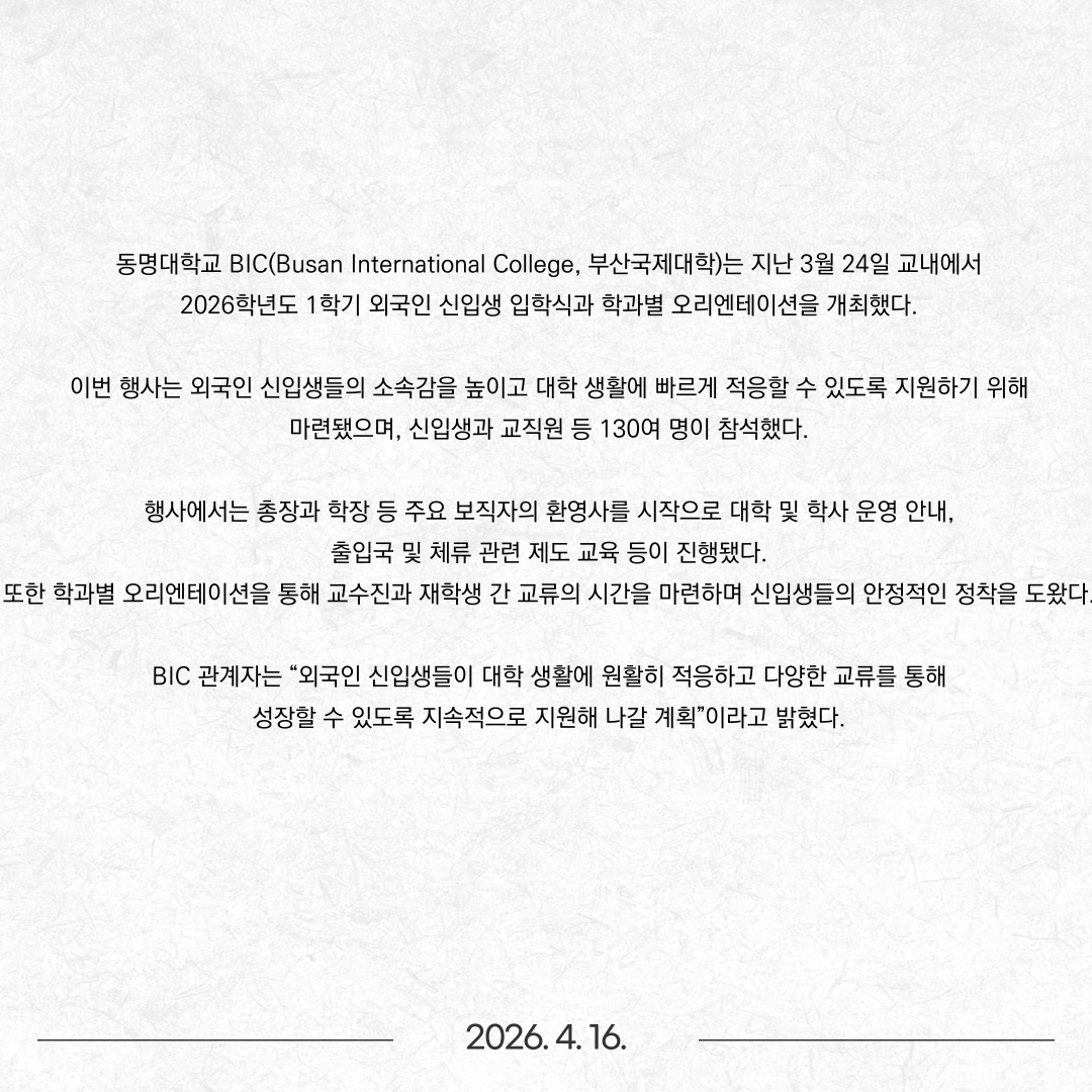 동명대 BIC, 외국인 신입생 입학식 및 오리엔테이션 개최