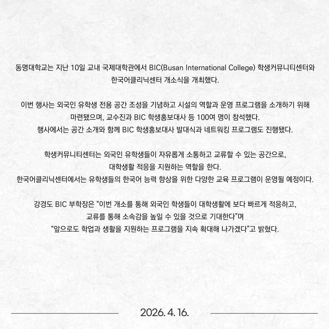 동명대, 외국인 유학생 적응 돕는 ‘BIC 학생커뮤니티센터’·‘한국어클리닉센터’ 개소